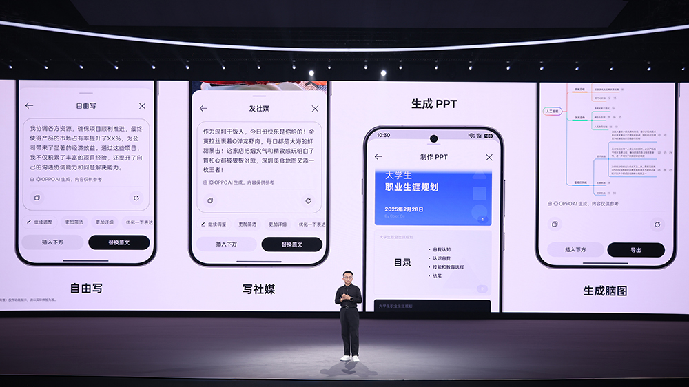 此外现在的“小布建议”范围更广,还多了简报功能。而全新的录音摘要功能支持实时分角色转写和 AI 摘要,系统级全局 AI 写作功能支持风格化写作(不仅能写好听的话,还能“一秒 5 喷”……发布会现场大家都会心一笑)和生成思维导图,而全新便签、智能的人像补光、焕新的相册、实况支持拼图等也都提升了操作效率或使用的乐趣。